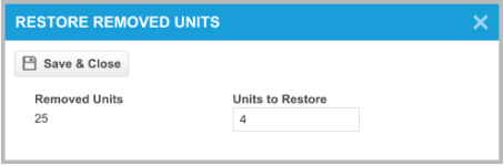 Esta opción solamente aparecerá si un elemento almacenado tiene un producto no serializado y además tiene un recuento de Unidades quitadas mayor a 0. Esto abrirá el cuadro de diálogo Restaurar unidades quitadas. Si no tiene permiso para editar productos de inventario, esta opción estará oculta. |