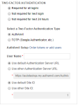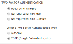IMPORTANTE AuthAnvil está solamente disponible para clientes que ya estén usando esta opción de autenticación en dos fases. Si aún no usa AuthAnvil, no aparecerán estos campos. Consulte Configurar una aplicación 2FA.