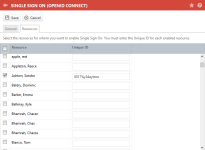 - Seleccione la casilla junto a cada usuario para el que desee habilitar Inicio de sesión único e ingrese el Id. de usuario de Okta en el campo Id. único.
