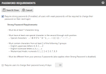 La configuración de sistema tiene dos componentes que pueden ser habilitados de modo separado, el requisito de contraseña segura en sí mismo y la frecuencia con la que se deben cambiar las contraseñas.