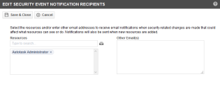 En esta página, usted selecciona los recursos e ingresa otras direcciones de correo electrónico para recibir notificaciones de correo electrónico cuando se efectúen cambios relacionados con la seguridad que puedan afectar lo que los recursos puedan o no ver. Para abrir la página, use la(s) ruta(s) de acceso en la sección Seguridad y navegación más arriba.