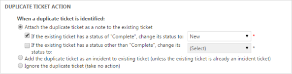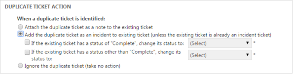 Para especificar cómo Autotask debe manejar un ticket entrante que cumpla con la definición de ticket duplicado, seleccione uno de los botones de radio bajo Acciones de tickets duplicados. Dependiendo del botón de radio que seleccione en esta sección, sus opciones de casilla de verificación cambiarán: