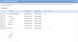 En esta página se crean y gestionan las fichas de los cuadros de mando que aparecen en los cuadros de mando de la organización. En el panel de control de la organización se muestran hasta cinco pestañas activas para todos los usuarios que tienen permisos de visualización para la organización. Los usuarios individuales no pueden editar las pestañas, pero pueden cambiar el orden de visualización.