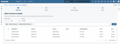 En esta página, puede revisar todas las organizaciones, contratos y servicios afectados por las selecciones realizadas en los pasos anteriores. Para cada instancia individual, se muestran el coste y los precios anteriores y nuevos, y se calcula el beneficio.