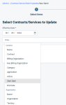 En la primera página del asistente, seleccione los servicios que formarán parte del lote de actualización. Para limitar la lista de servicios que se actualizarán, puede filtrarla por servicio, contrato y organización. puede aplicar criterios de filtrado a los siguientes campos: