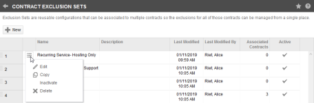 | Nuevo botón (situado encima de la tabla) | Abre la página Nuevo conjunto de exclusiones de contrato. Consulte Agregar, editar o copiar un conjunto de exclusiones de contrato. |