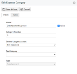 | Activa | Con esta casilla seleccionada, la categoría de gasto está activa. Desmarque la casilla para desactivar la categoría. Una categoría de gasto inactiva no está disponible para selección al agregar o editar un elemento de gasto. |