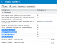 Si no está seguro de qué códigos de tiempo internos son los que se utilizan en las políticas de tiempo libre, vaya a Menú de navegación de la izquierda > Admin > Categorías de administración > Características y configuraciones > Características a través de la aplicación (compartidas) > Configuración del sistema > Hojas de horas y busque las opciones que empiezan por Habilitar.