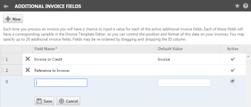 Usted puede crear hasta 20 campos de texto personalizados (con valores predeterminados) para ser incluidos como variables en sus plantillas de facturas. Cuando procese facturas, podrá modificar los valores predeterminados para estos campos de esa sesión específica de generación de facturas.
