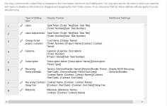 La columna Descripción en la plantilla de factura no solo representa un campo de datos de Autotask, como las otras columnas, sino que representa múltiples campos. Usted puede personalizar el contenido que aparece en esta columna para cada tipo de elemento facturado. Usted también puede especificar el orden en que desea que aparezcan los tipos de elementos arrastrando y soltando filas en el criterio de ordenación deseado.