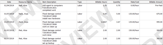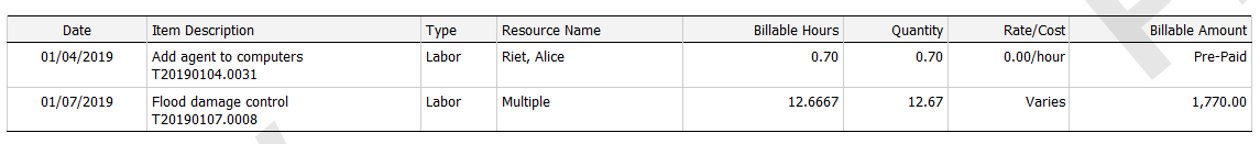 Si la configuración Agrupar está establecida como "Mano de obra por tarea/ticket", los cuatro elementos de mano de obra del ticket Control de daños de la inundación(T20170908.0001) se combinan en un solo elemento.