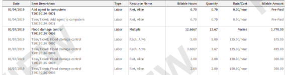 Cuando usted agrupa Mano de obra por tarea/ticket o Mano de obra por tarea/ticket y tipo de trabajo, el número de ticket solo aparecerá en la columna Descripción de la fila de agrupación si aparece en la descripción del elemento detallado.