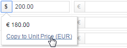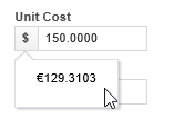 - Si usted hace clic en el indicador de divisa de la divisa seleccionada del cliente, la casilla de traducción de divisas mostrará el importe en su divisa interna: Valor que aparece = Valor de campo * Tasa de cambio para la divisa seleccionada del cliente.