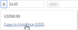 - Para tener un indicio de cuál sería el precio en la segunda divisa de acuerdo a la tasa de cambio, haga clic en el símbolo de divisa del precio unitario interno. Para aceptar el precio, haga clic en el vínculo Copiar a precio unitario (...)