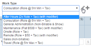 | Tipo de trabajo | De manera predeterminada, no hay ningún tipo de trabajo seleccionado. Para ver cómo un tipo de trabajo influye en sus tarifas de facturación por hora, haga clic en un menú desplegable y seleccione un tipo de trabajo. Se rellenará la columna Tarifa luego del modificador de tipo de trabajo. Haga clic en el ícono Editar o Nuevo junto al campo para editar los modificadores de tipo de trabajo de cualquier divisa activa. Consulte Configurar modificadores de tipos de trabajo. |