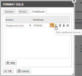 Le permite aplicar un formato de número y un estilo de borde a una celda, además de aplicar formatos condicionales. El formato condicional no está disponible en reportes rápidos. Para aplicar formatos condicionales, seleccione la celda y haga clic en el ícono Dar formato a celdas. Luego, haga clic en la pestaña Condicional. Si no hay ninguna condición, haga clic en Agregar. Haga clic en el símbolo Editar formato condicional. Se abrirá la página Editor de fórmula. Para aplicar el formato condicional según el valor de celda de la celda seleccionada, haga clic en el botón + Valor de celda e ingrese un operador (=, >, <) y un valor. También, usted puede por supuesto ingresar una fórmula de la manera usual. Consulte fórmulas de LiveReports. SUGERENCIA Para un mejor resultado, use el botón + Valor de celda. SUGERENCIA Este ícono, |