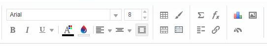 | Otros íconos | Resalte una celda o varias celdas (Shift + Hacer clic o CTRL + Hacer clic para celdas no secuenciales) y haga clic en un ícono para seleccionar una fuente, dar formato al texto, justificar y ajustar el texto en las celdas, determinar el formato de números y dar formato a bordes y colores de celdas. Las herramientas de formato serán familiares para cualquiera que haya usado herramientas de formato en Microsoft Excel. Desplace el cursor sobre un ícono para ver el nombre de la herramienta. Las opciones para combinar celdas, dividir celdas y ajustar texto no están disponibles en reportes rápidos. |