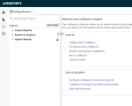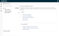 NAVEGACIÓN Menú de navegación de la izquierda > Admin > Categorías de administración > Características y configuraciones > LiveReports > Diseñador de LiveReports.