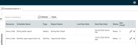 Los usuarios con permisos para Gestionar reportes programados pueden supervisar y quitar programas de reportes desde la pestaña Programar reportes. La pestaña muestra lista de reportes programados, la última vez que fueron ejecutados, la próxima vez que serán ejecutados y otras opciones. Usted puede también vaciar todos los programas completados o eliminados de la lista, como asimismo eliminar un programa específico.![]()