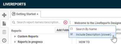 en la barra de búsqueda y seleccione Incluir descripción (es más lento). El aviso cambia a Buscar nombres/descripciones de reportes. Presione Enter para buscar. Para volver a búsqueda solamente por nombre, haga clic en el ícono y seleccione Buscar por nombre.