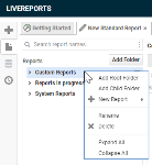 En la página Diseñador de LiveReports, es posible crear, editar y gestionar LiveReports y las carpetas usadas para organizarlos. Para abrir la página, use la(s) ruta(s) de acceso en la sección Seguridad y navegación más arriba. La página siempre se abre en una ventana aparte mostrando el árbol de carpetas.![]()