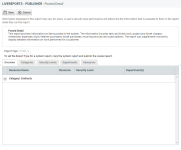 Esta pestaña le da una visión general de todas las categorías en las que se ha publicado este reporte y de los recursos que tendrán acceso a este reporte, basándose en sus selecciones en las pestañas Categorías, Niveles de seguridad, Departamentos y Recursos. La información que aparece en esta pestaña es de solo lectura y solo puede ser modificada haciendo ajustes a las otras pestañas en esta página. Se brinda la siguiente información: