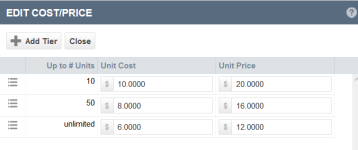 - Ingrese un Costo unitarioy Precio unitario para el nivel "ilimitado". El nivel ilimitado es solamente su único nivel de precios, o su nivel de precios más bajo.