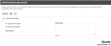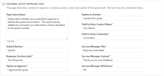 Esta sección le permite personalizar el texto y las etiquetas de la sección Aprobación externa de la cotización. Usted puede editar las instrucciones de página y las etiquetas de todos los campos. |