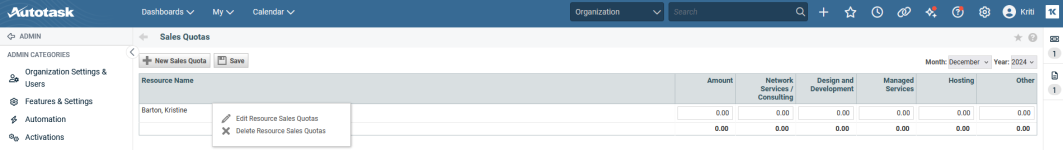 Autotask le permite establecer cuotas de ventas para todos los recursos de ventas en su organización. El rendimiento real de las ventas puede medirse con respecto a la cuota de cada recurso de ventas, territorio o región de forma mensual, trimestral o anual.