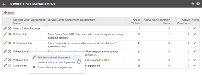 | Editar acuerdo de niveles de servicio | Haga clic en el ícono de edición o seleccione esta opción para hacer cambios a un SLA existente. Consulte Agregar y editar acuerdos de niveles de servicio. |