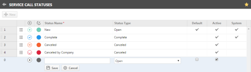Las llamadas de servicio tienen un atributo configurable Estado que está disponible en búsquedas, filtros, reglas del flujo de trabajo y en el Calendario de distribución, como asimismo en la página Llamada de servicio y en todas las listas de llamadas de servicio. Hay dos estados de sistema pre-configurados (Nuevo y Completado), pero los administradores pueden crear hasta 50 estados activos.