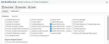 Estos campos le permiten a usted ingresar hasta 4 grupos de correos electrónicos, separados con coma o punto y coma, que se usan con notificaciones de reglas del flujo de trabajo de Atención al cliente. Usted puede ingresar correos electrónicos en cualquier campo; no tiene que rellenar primero el campo Otros correos electrónicos. Al crear o editar una regla del flujo de trabajo de tickets, estas direcciones de correo electrónico estarán disponibles para notificación desde la lista de destinatarios dinámicos cuando ocurran eventos relacionados a la cola. |