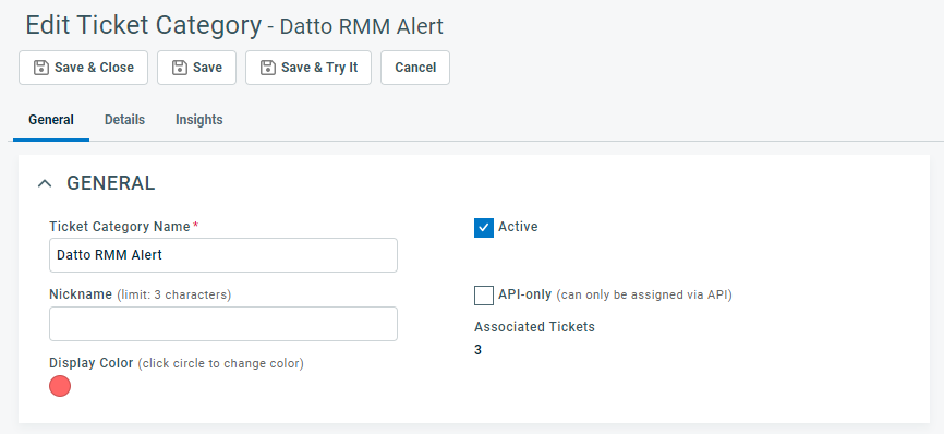Elementos y descripciones de campos de la página Ticket - Si va a crear o editar una categoría de ticket, haga clic en Guardar y probar para acceder a una vista previa de cómo se verá su interfaz de ticket con la configuración de categoría de ticket actual.