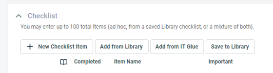 Sólo en los tickets, los usuarios que tienen activada la integración con IT Glue pueden generar una lista de comprobación de tickets de Autotask a partir de una plantilla de lista de comprobación de IT Glue.