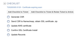 - En la sección Lista de comprobación del ticket, haga clic en Agregar de IT Glue.