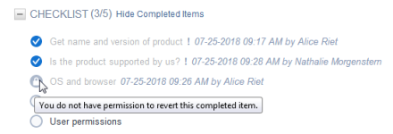 Los elementos de la lista de comprobación que puede descompletar y eliminar dependen de sus permisos de seguridad: