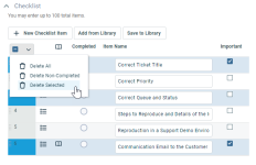 Quitará el elemento de la lista de comprobación. NOTA Para eliminar toda la lista de comprobación del ticket, utilice el menú masivo. Consulte Eliminar elementos de la lista de comprobación de un ticket, tarea u oportunidad. |