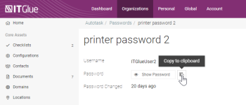 Esta visión mostrará las contraseñas relevantes de IT Glue. Para que esta información aparezca para un recurso, la integración de IT Glue debe estar activada y el recurso debe haberse conectado a su cuenta de IT Glue en su página de perfil. Consulte Integration with IT Glue y Gestionar su perfil. Cuando se visualice un ticket con una vista informativa de IT Glue, ocurrirá lo siguiente: