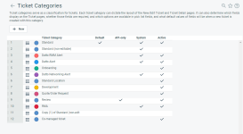 Una marca de verificación en esta columna indica que la categoría de ticket está activa y disponible para selección en menús y listas. El número máximo de categorías activas para las diversas entidades es el siguiente:
