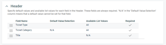La sección Encabezado contiene la lista de campos que aparecen para cada categoría de esa entidad. Estos aparecen al principio del panel principal cuando se aplica la categoría. Para algunos campos, usted puede configurar un Valor/Selección predeterminado y limitar todos los Valores de lista disponibles.