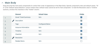 Para cambiar el orden de visualización de los campos que aparecen en ticket (los campos que aparecen bajo fila 1, Campos de cambio visibles), haga clic y arrastre y coloque las filas para ordenarlas en el orden de visualización preferido. |