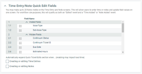 Esta configuración le permite seleccionar hasta veinte campos de ticket adicionales para que aparezcan en las páginas Nueva entrada de tiempo, Editar entrada de tiempo, Nueva nota y Editar nota bajo el encabezado Ediciones rápidas de tickets. Hacer que un campo sea visible le permite que sea modificado al ingresar tiempo o agregar una nota en el ticket.