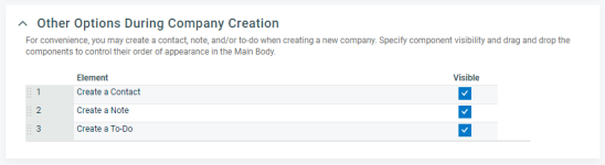 Cuando creas una nueva organización, puedes, al mismo tiempo y en el mismo formulario, crear un contacto, una nota y una tarea. La visibilidad de los campos de estas entidades está controlada por la categoría de organización. Todas las opciones son visibles de manera predeterminada.