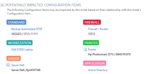 Este componente muestra los dispositivos que están relacionados con el dispositivo, o el dispositivo principal asociado al ticket. Cuando está visible para la categoría de ticket, el dispositivo principal asociado con el ticket aparece primero, incluidos el Nombre del producto, el Nombre de referencia, el Número de referencia y el Número de serie, si está disponible. A continuación aparecen todos los dispositivos principales o secundarios del dispositivo principal, agrupados por categoría de dispositivo. Si el primario tiene un dispositivo padre, el nombre del producto del padre aparece encima del nombre del producto del primario. En las páginas de tickets, esta sección se denomina Dispositivos potencialmente afectados, y en ella aparecen los dispositivos relacionados con el dispositivo del ticket. Consulte Gestión de las relaciones entre dispositivos (pestaña Elementos relacionados). |