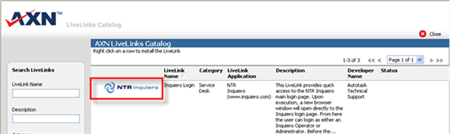 Los usuarios con acceso al Diseñador de LiveLinks pueden explorar el catálogo de AXN. Presenta todos los LiveLinks disponibles creados por Autotask PSA o un miembro de su comunidad de usuarios. Los usuarios con permiso para instalar LiveLinks pueden descargar e instalar LiveLinks desde el catálogo.