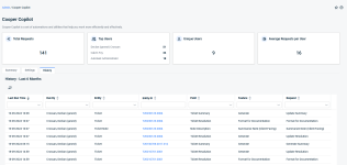 En la página Historial de Cooper Copilot puede consultar el historial de llamadas a Cooper Copilot. Esta página muestra las solicitudes de Cooper Copilot de los últimos 6 meses, así como un resumen general de los últimos 30 días.