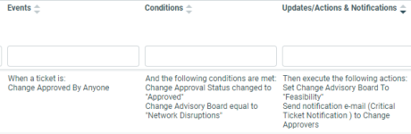 Las columnas Eventos, Condiciones y Actualizaciones/Acciones y Notificaciones de cada regla de flujo de trabajo se leen como una frase que resume lo que hará la regla de flujo de trabajo cuando se active.![]()