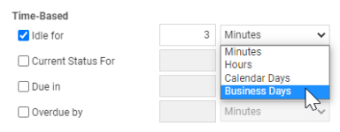Los eventos SLA son similares a los eventos basados en tiempo, pero tienen dos selecciones adicionales de marco de tiempo: Minutos de SLA y Horas de SLA. La diferencia entre Horas y Horas de SLA, al configurar una regla de flujo de trabaj,o es que pueden personalizarse las horas de SLA. Para más información sobre la configuración de horas personalizadas para sus acuerdos de niveles de servicio, consulte Definir objetivos de SLAs y Configurar horas personalizadas del SLA. |