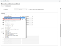 SUGERENCIA La lista de atributos Condiciones incluye los campos definidos por el usuario de su organización local. Consulte Campos definidos por el usuario (UDFs) en reglas del flujo de trabajo.