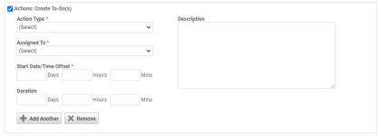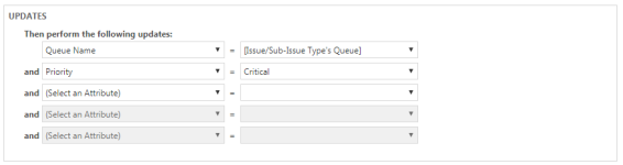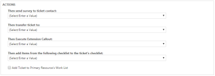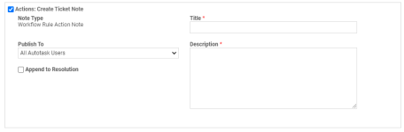 Esta área le permite ordenar a Autotask que automáticamente lleve a cabo ciertas acciones cuando se active la regla del flujo de trabajo. Solo está disponible para reglas del flujo de trabajo de tickets, tareas y oportunidades. Para incluir una acción a la regla del flujo de trabajo, seleccione un valor y/o una casilla de verificación.